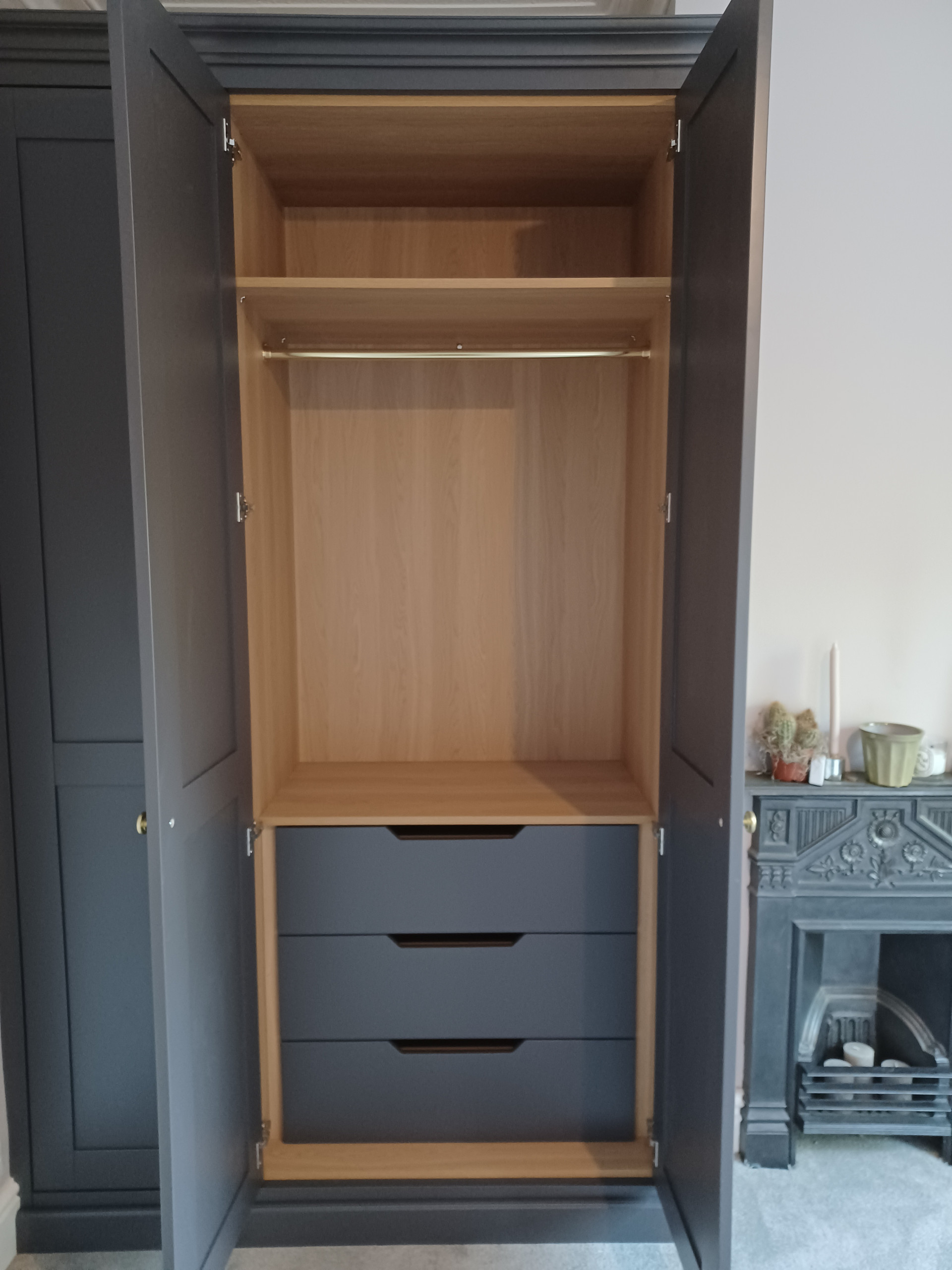 the aim of the project was to transform the alcove spaces into functional and practical wardrobe space while maintaining the traditional look of the house, we done this beautifully with this set of traditional shaker wardrobes.
